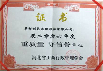 2006年2月,被河北工商行政管理協(xié)會授予“重質(zhì)量 守信譽(yù)”單位。