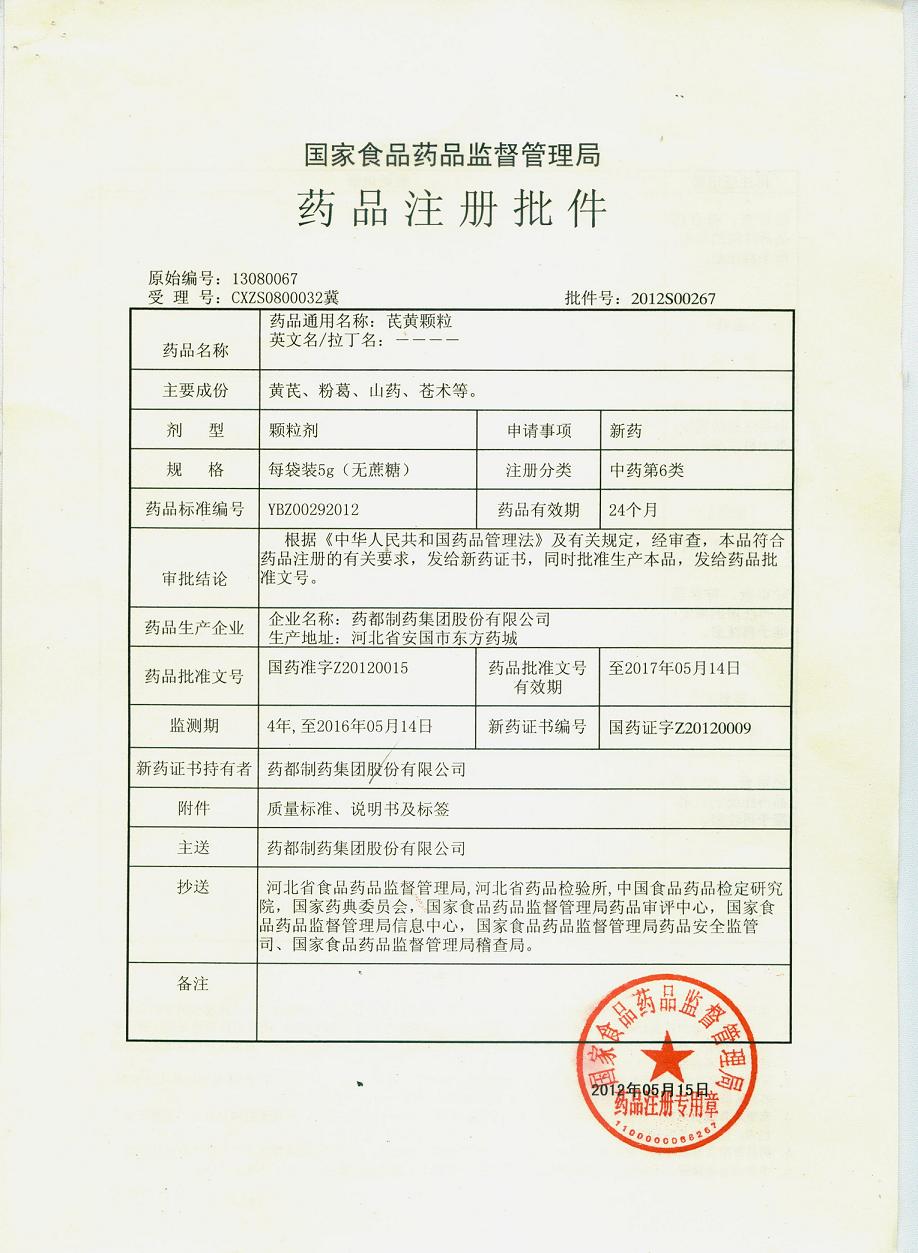 2012年5月15日,我公司新產(chǎn)品芪黃顆粒取得國家食品藥品監(jiān)督管理局藥品注冊批件,并頒發(fā)新藥證書。