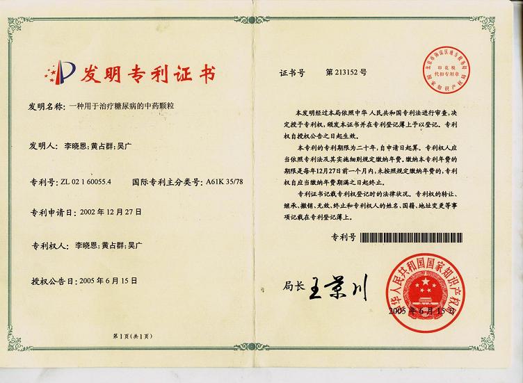 芪黃顆粒是我公司自主開發(fā)研制的產(chǎn)品,具有自主知識產(chǎn)權(quán)。自1999年開始,我公司利用現(xiàn)有的科研優(yōu)勢和關(guān)于糖尿病治療的相關(guān)基礎(chǔ)資料,參閱中醫(yī)大量有價(jià)值的文獻(xiàn)資料,汲取典型配方精華,經(jīng)過藥理、毒理研究和三期臨床試驗(yàn),研制出在糖尿病治療中有顯著療效的芪黃顆粒中藥六類新藥(原中藥三類新藥)。2011年5月,通過國家食品藥品監(jiān)督管理局有關(guān)專家進(jìn)行現(xiàn)場檢查和抽樣,2012年5月,我公司芪黃顆粒取得了藥品注冊批件和新藥證書。